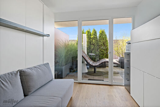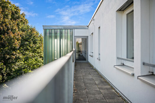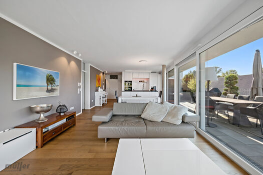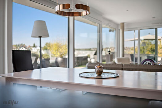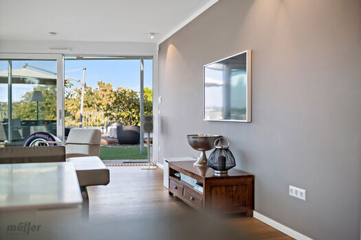 Bodentiefe Fenster mit mehreren Zugängen zur Dachterrasse sorgen für maximale Transparenz sowie Helligkeit und verbinden Innen- mit Außenbereich auf wohnliche Weise.