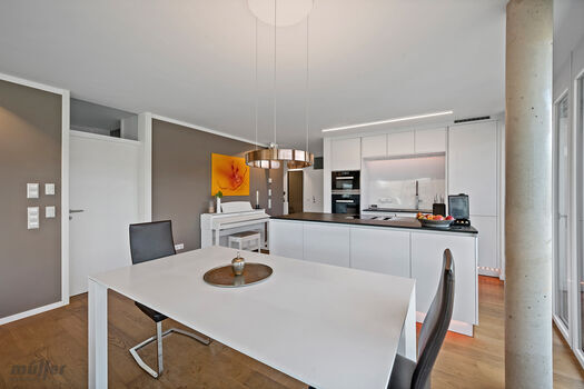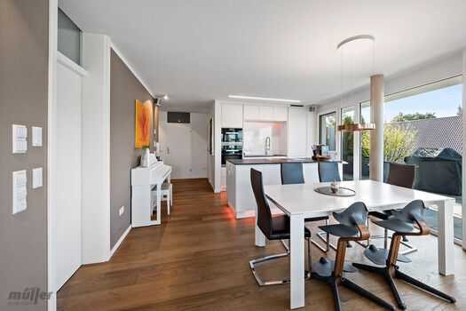 Im Wohn-und Esszimmer befindet sich die offene Kochzone mit hochwertigen Miele-Geräten und eine Kochinsel mit ausreichend Arbeitsfläche – ideal für kullinarische und gesellige Kochmomente.