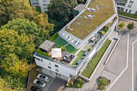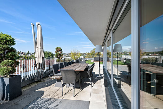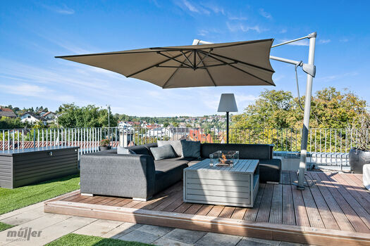 Die privatisierte Dachterrasse vermittelt ein Gefühl von Villa-Charakter und Privatsphäre in der Kernstadt Rottenburg.