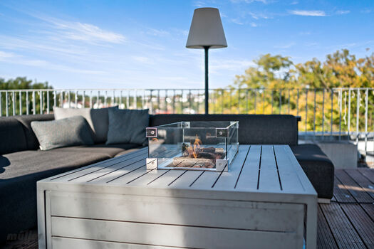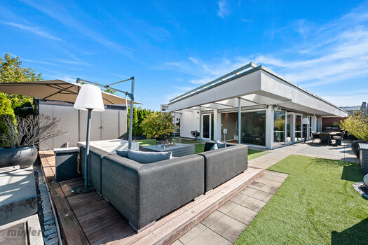 Die Dachterrasse mit Teilüberdachung umfasst eine Gesamtfläche von 220 m² und ist das absolute Highlight des Objekts: Diverse Freisitzmöglichkeiten in Form von stylischen Loungebereichen auf einem Holzdeck, Essgruppe und Barbecue Möglichkeiten garantieren Ihnen stilvolle Gartenparties oder entspannte Stunden mit Freunden und Familie – ganz nach Ihrem Geschmack.