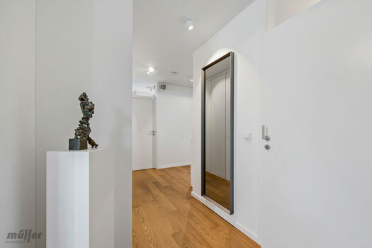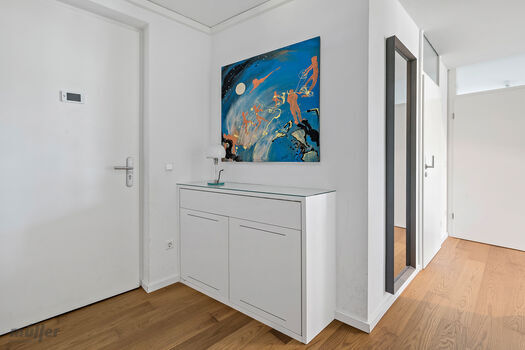 Der Eingangsbereich der Wohnung beinhaltet einen Einbauschrank und die jeweiligen Zugänge zum Gäste-WC mit Dusche, einem Abstellraum und einem Zimmer für Gast oder Homeoffice.