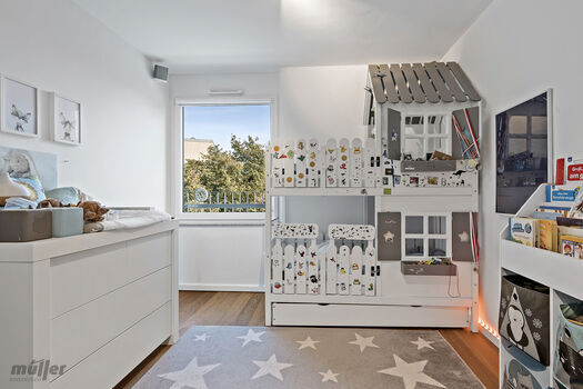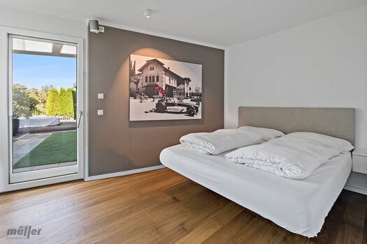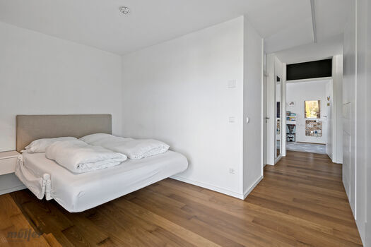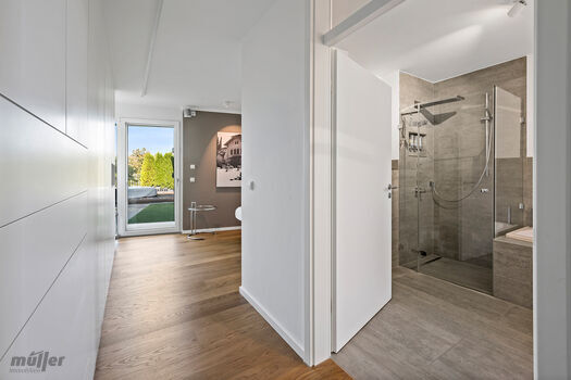 Angrenzend bietet der sep. Master-Bereich mit offenem Schlafzimmer inkl. Einbauschrank und Bad en Suite sowie einem weiteren Schlafzimmer, ebenfalls mit Einbauschrank, vielfältige Nutzungsmöglichkeiten für z.B. Kind oder Ankleide.